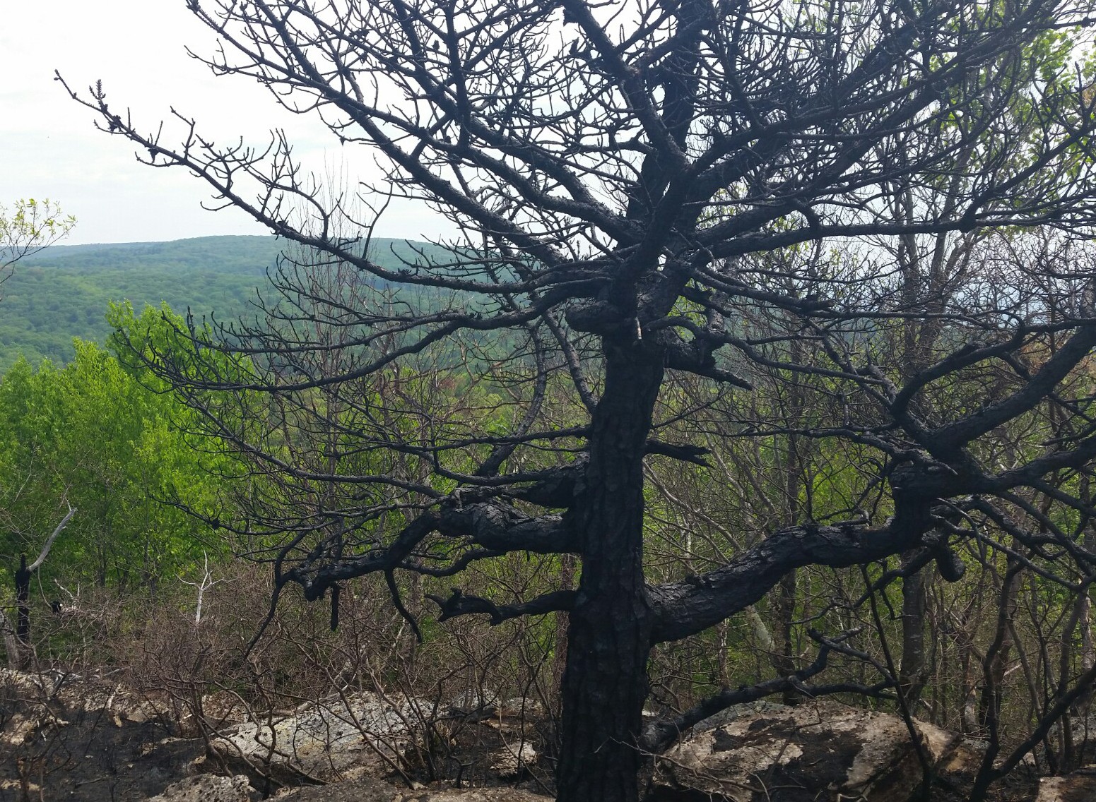 The first weekend in May was warm, dry, and breezy. Driving home Sunday afternoon, we saw smoke rising in the valley. Later we learned that a homeowner burning rubbish had accidentally ignited a small fire. Volunteer firefighters and state forest rangers bulldozed lanes through the woods to contain the blaze. But the flames lept over the firebreaks and fanned by dry winds spread rapidly across the ridge. Before it was finally extinguished, the fire had engulfed 2,000 acres in the heart of the Shawangunk Mountains.