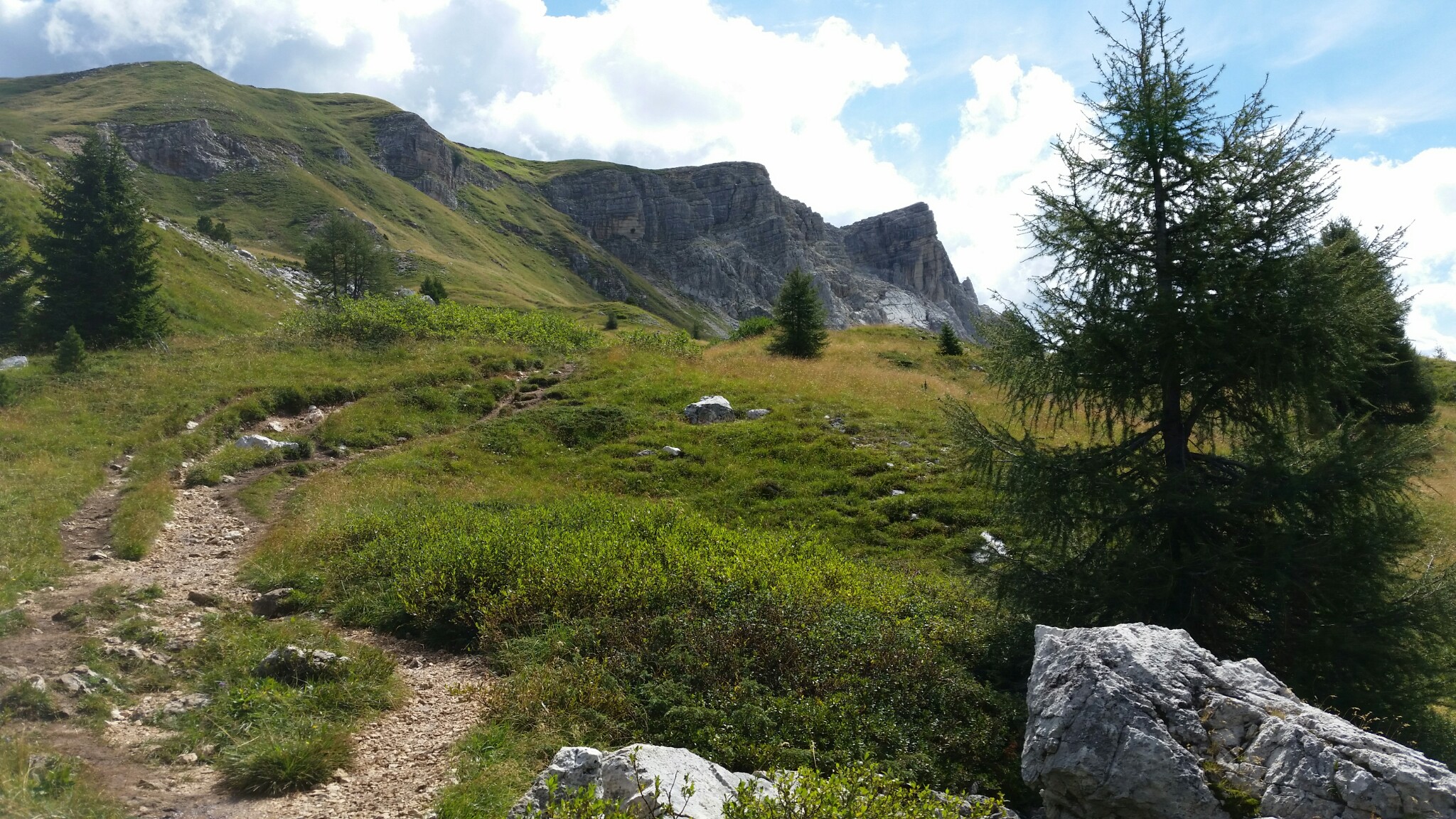 As I made my way around the base of Setsas, the peaks of Col di Seif and Col di Lana were soon in sight, but they still seemed far away, lying behind a saddle on the ridge, with a long climb to the top. The tourist hiking map in my possession was not drawn to scale, and it was going to take longer than expected to reach my objective.