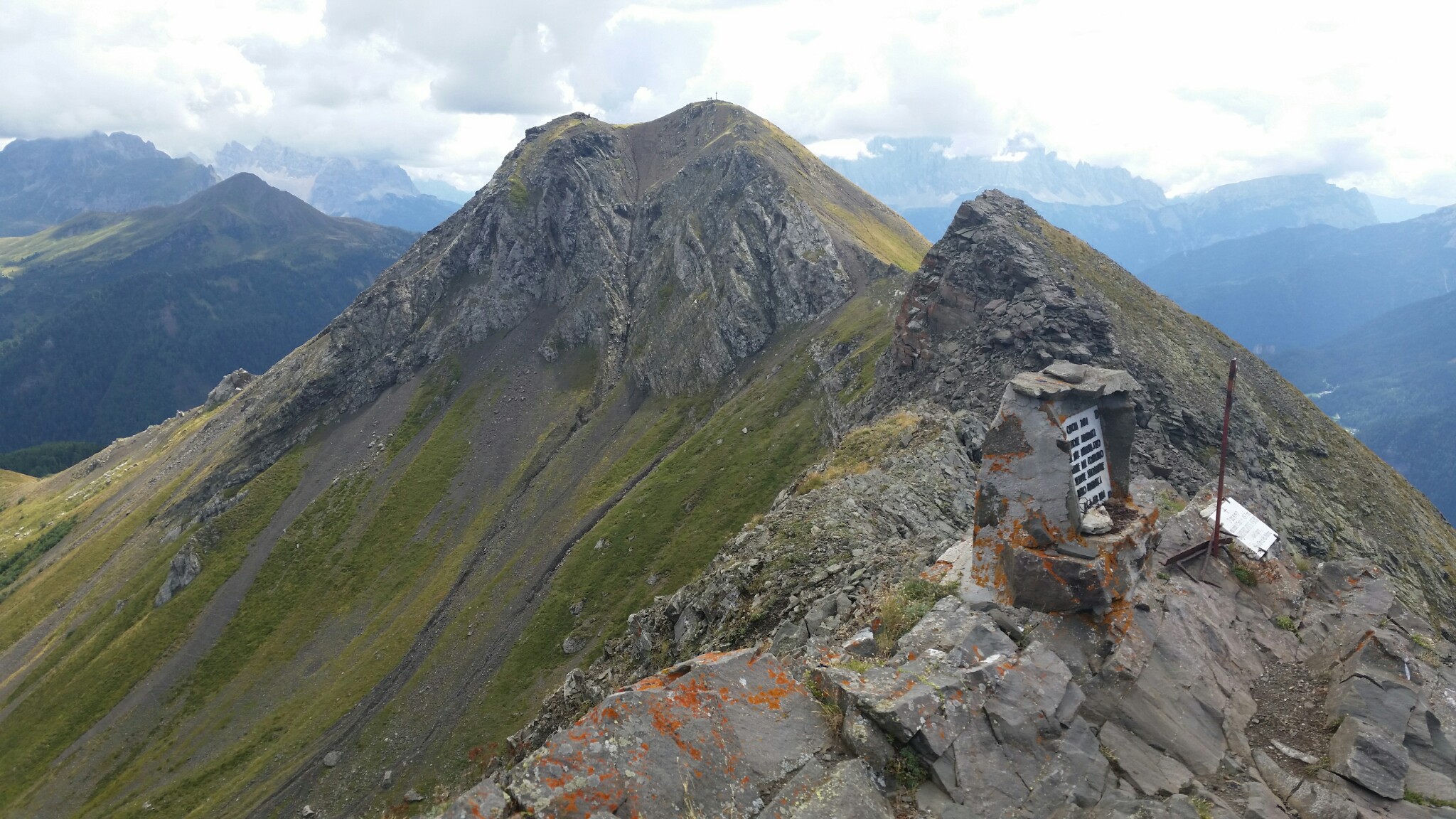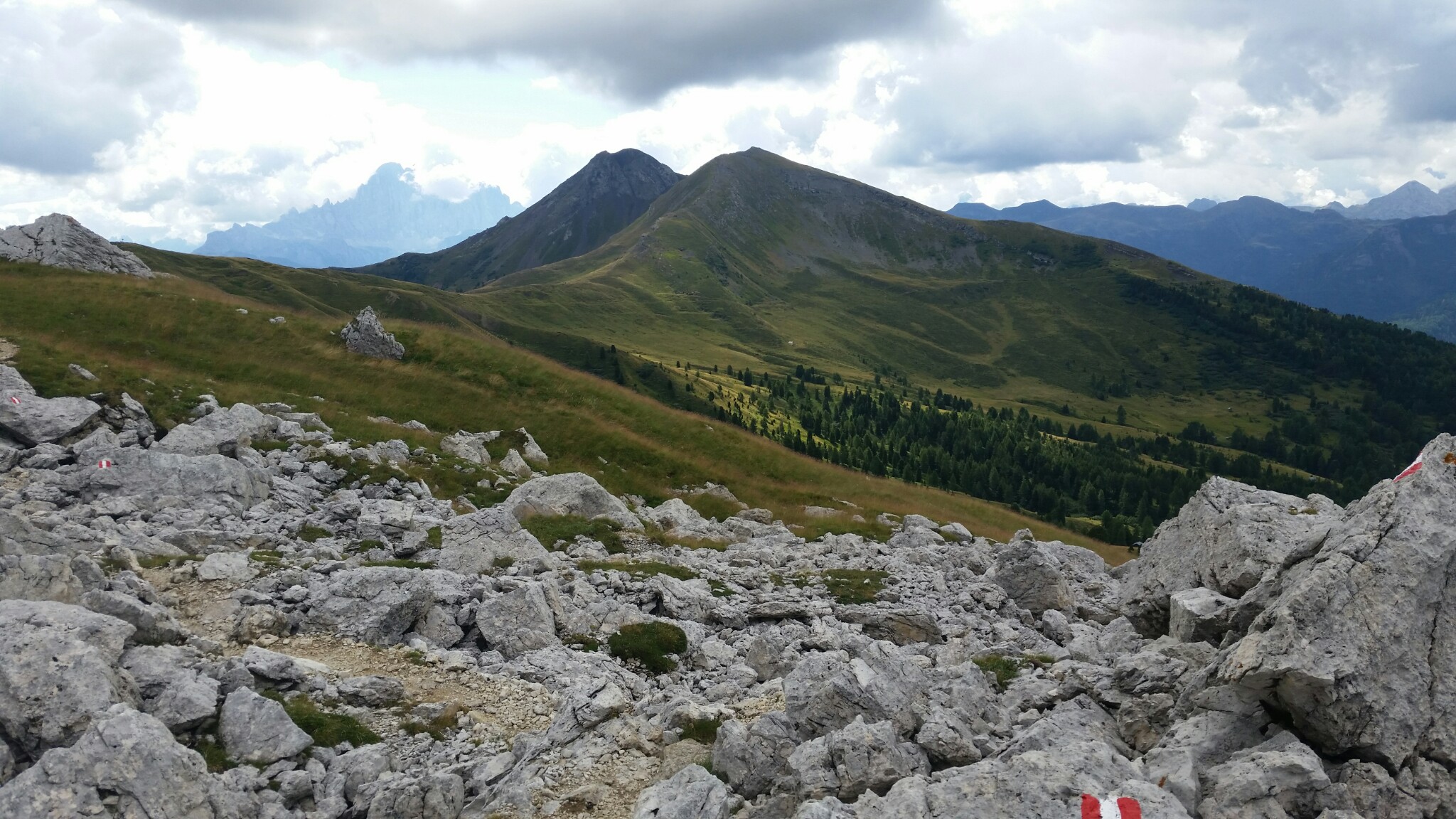 After a steep uphill climb, I made it to the top of Col di Sief to discover a cross, inscription, and panoramic views. My objective, Col di Lana, was not far off, but the ridge between the two summits looked narrow and rocky. There was a group of hikers heading out in that direction, but I noticed they were wearing helmets and harnesses. I peered at the trail across the ridge, and it looked slippery and exposed. Meanwhile, the clouds were moving closer and the wind was picking up. Not properly equipped, I didn’t proceed any further.