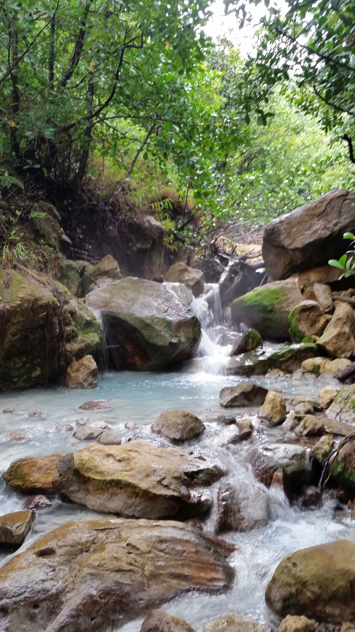 We made our way down a steep muddy footpath, crawled over large wet rocks, and soon found ourselves stepping among sulfur pits that were bubbling, spitting, and smoking away.  We had reached the Valley of Desolation.  Through the middle of the valley ran a stream of bluish-grey water.  I dipped a finger in and discovered it was pleasantly warm.  Further on, a group of tourists was bathing in a small pool.