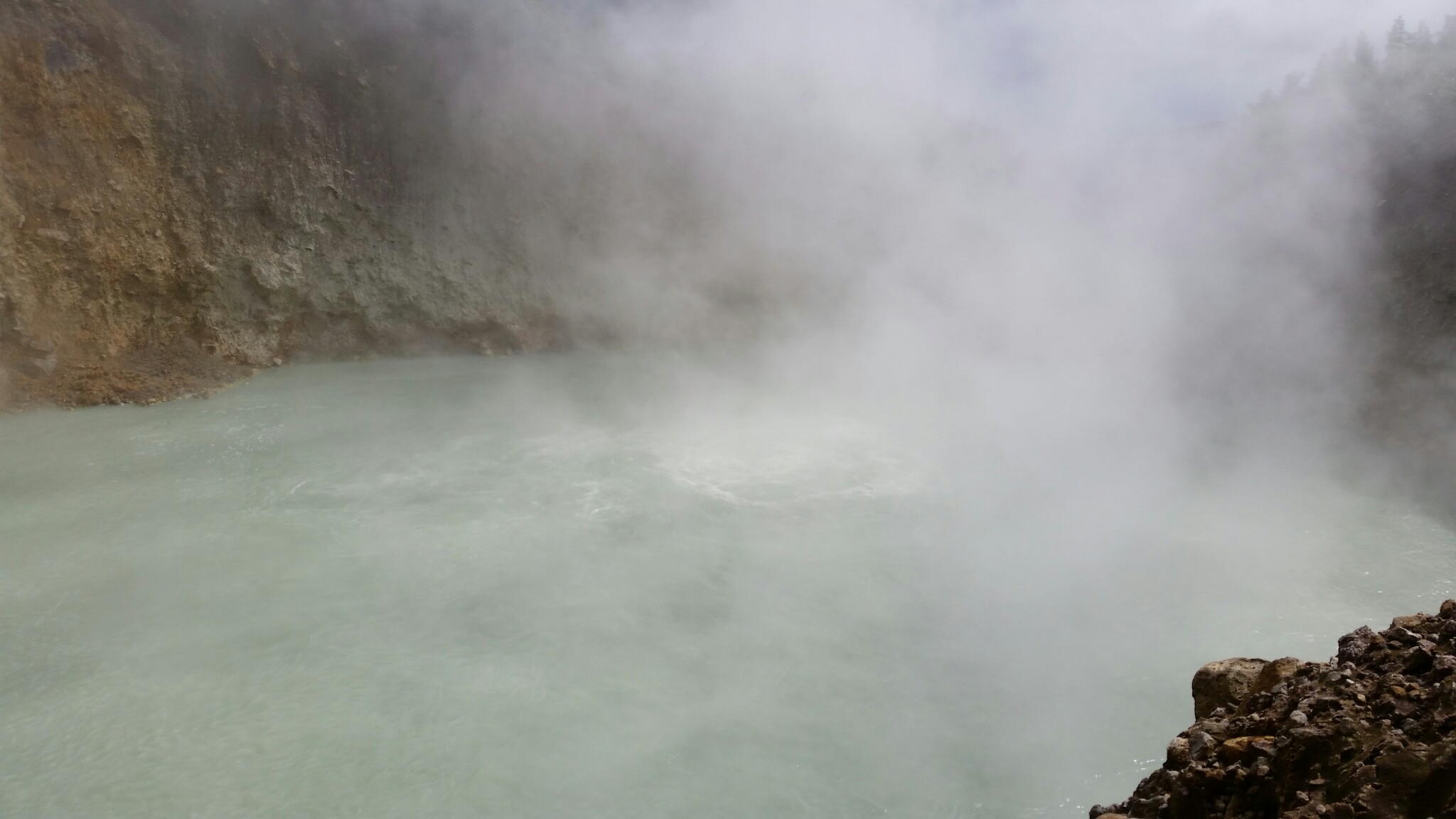 In due course, we arrived at bluish-grey lake, about two hundred feet across, swathed in mist. As the wind stirred the vapors, we could see large bubbles frothing in the center.  Evidently, water seeps down through a “fumarole” or a crack in the Earth’s crust to a pool of molten magma, and then the super-heated steam boils back up.
