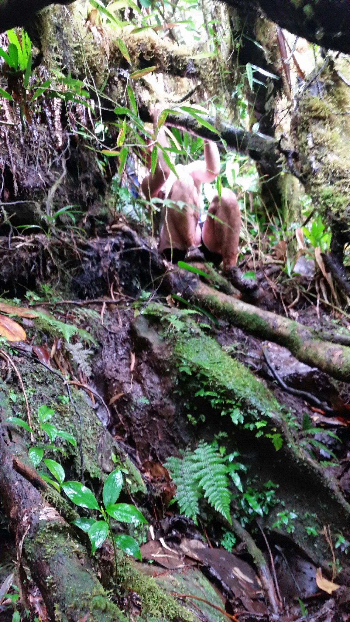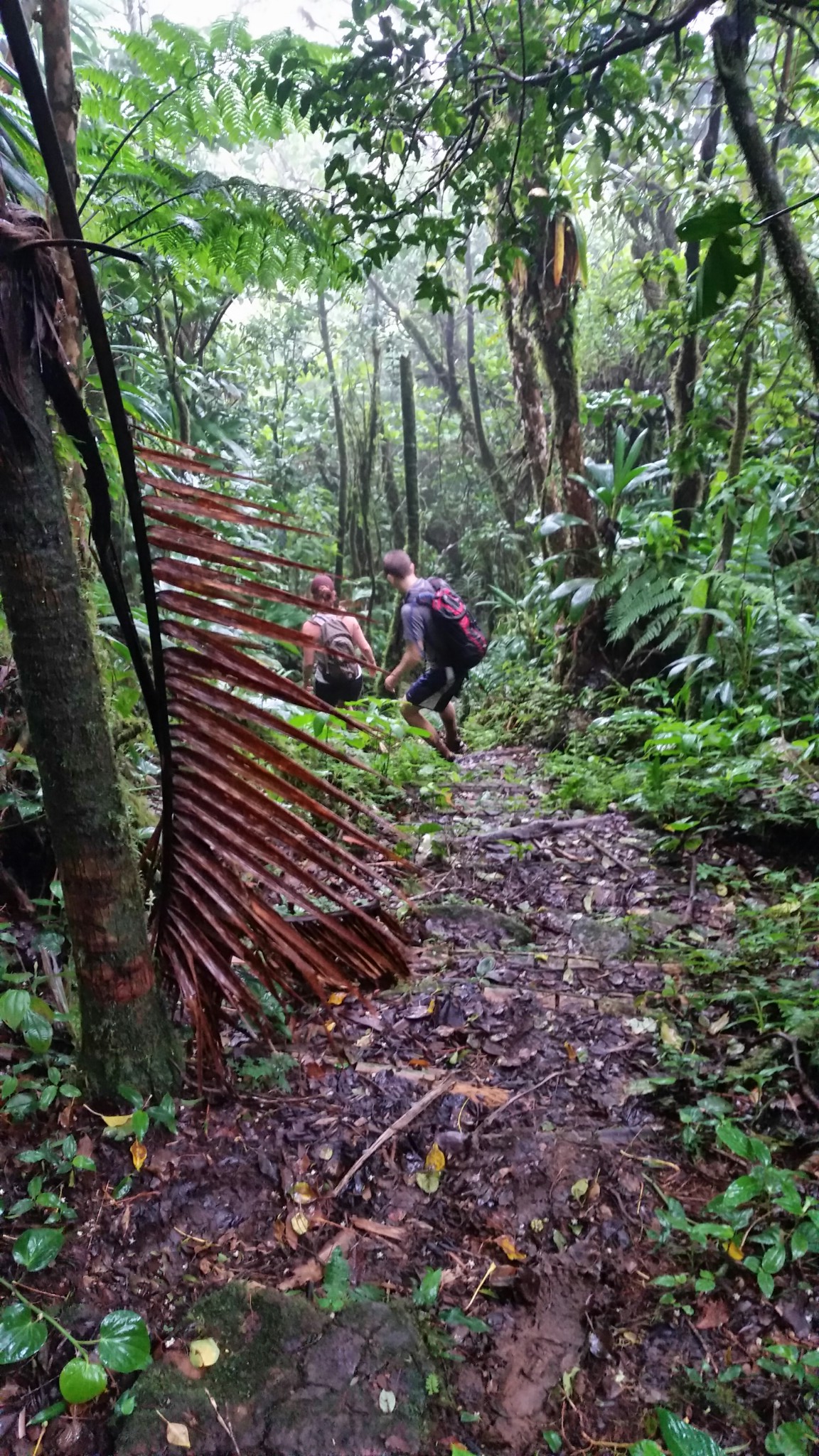 The trail lurched through deep mud puddles, took us up and over rock faces, and then we were climbing into and through the trees, stepping from one branch to another, twisting our bodies underneath and around other branches.
