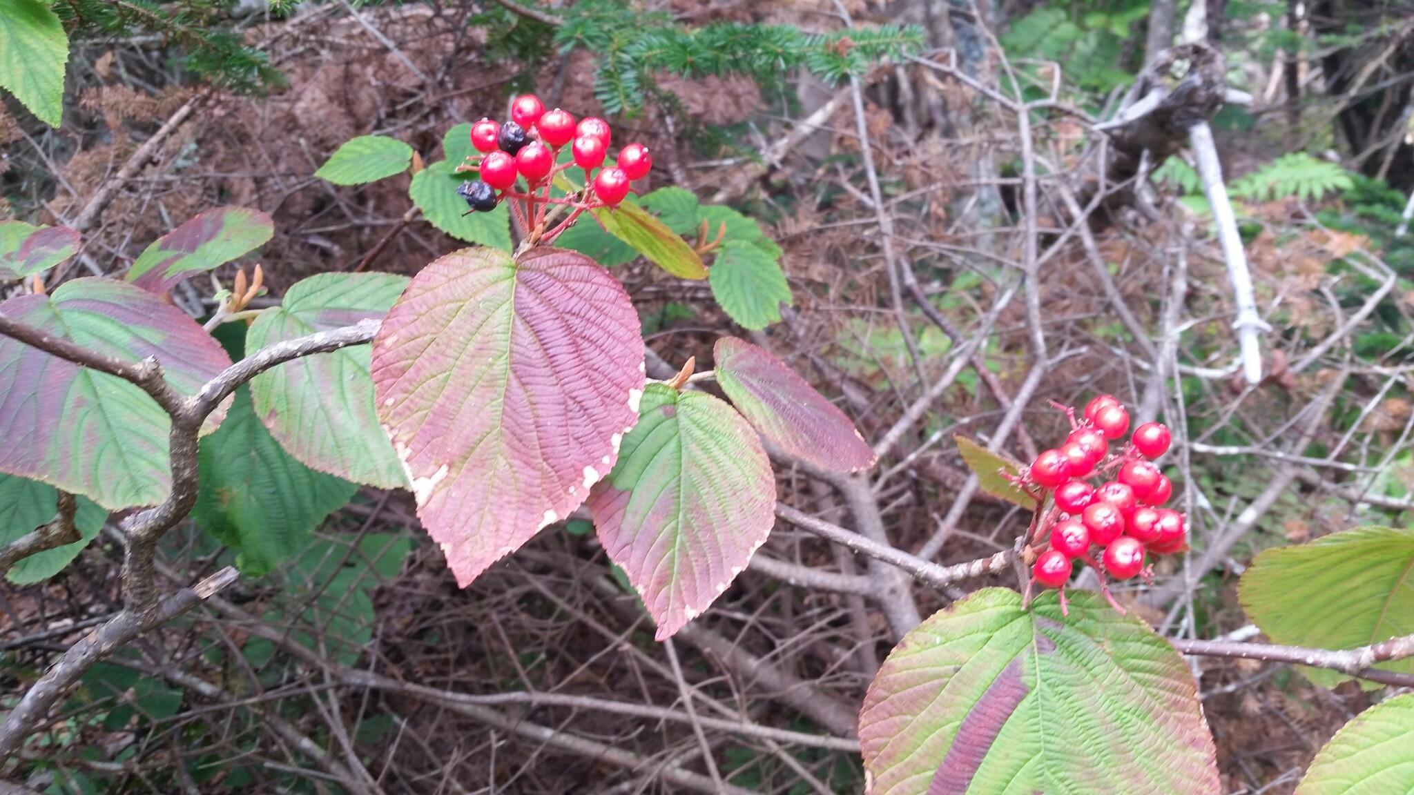 Near the summit, I finally figured out the mystery of the berries. They were from my old friend the Hobblebush, which on previous bushwhacking trips in the Catskills had managed to trip me up. But now the Hobblebush didn’t seem as vigorous, with its leaves turning a bruised purple, as if its last energy for this season had gone into producing this crop of berries. During one of his visits to the Maine woods, 19th century transcendentalist Henry David Thoreau tried eating hobblebush berries and reported they were “seedy and insipid.” I’ve never been tempted.