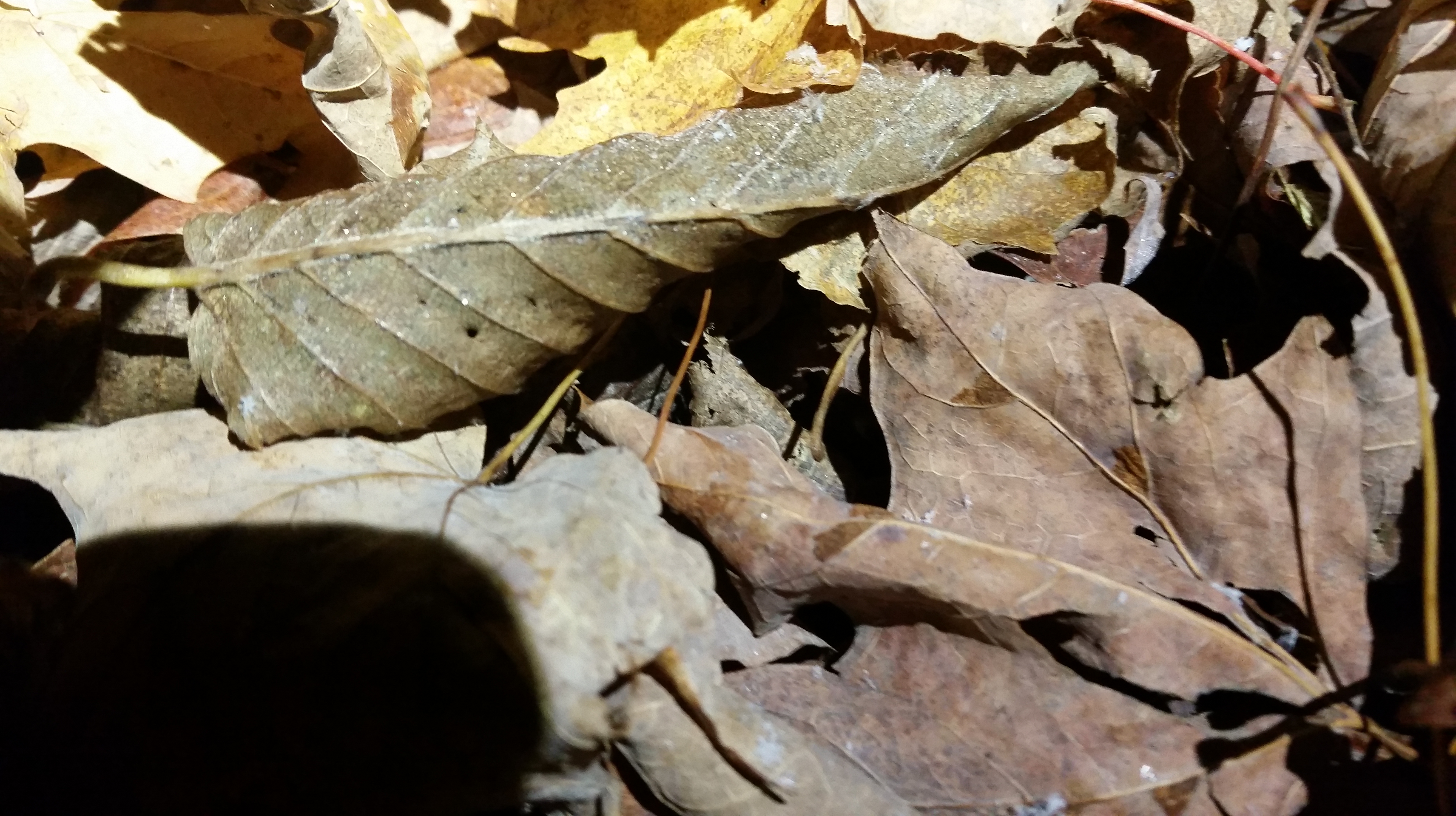 As is often the case in the Catskills, the trail started out along an old logging road covered in rocks.  But instead of smoothly worn shale and sandstone fragments (the eroded remnants of the primordial Catskill river delta), this road was covered in sharp chunky rocks, which must have been crushed by heavy equipment and then trucked here from a quarry.  It would have been a difficult surface to contend with even in the daylight, but at night and covered in a thin layer of dry leaves, the hazards were hidden and impossible to avoid.  One step landed me on a sharp point.  The next got a stone caught under my arch, and then the side of my foot glanced into a lurking rock.  And this happened with every stride.  My first objective was a Y-junction in the trail, 0.7 miles distant and 600 feet up in elevation.  I wasn’t sure I was going to make it.