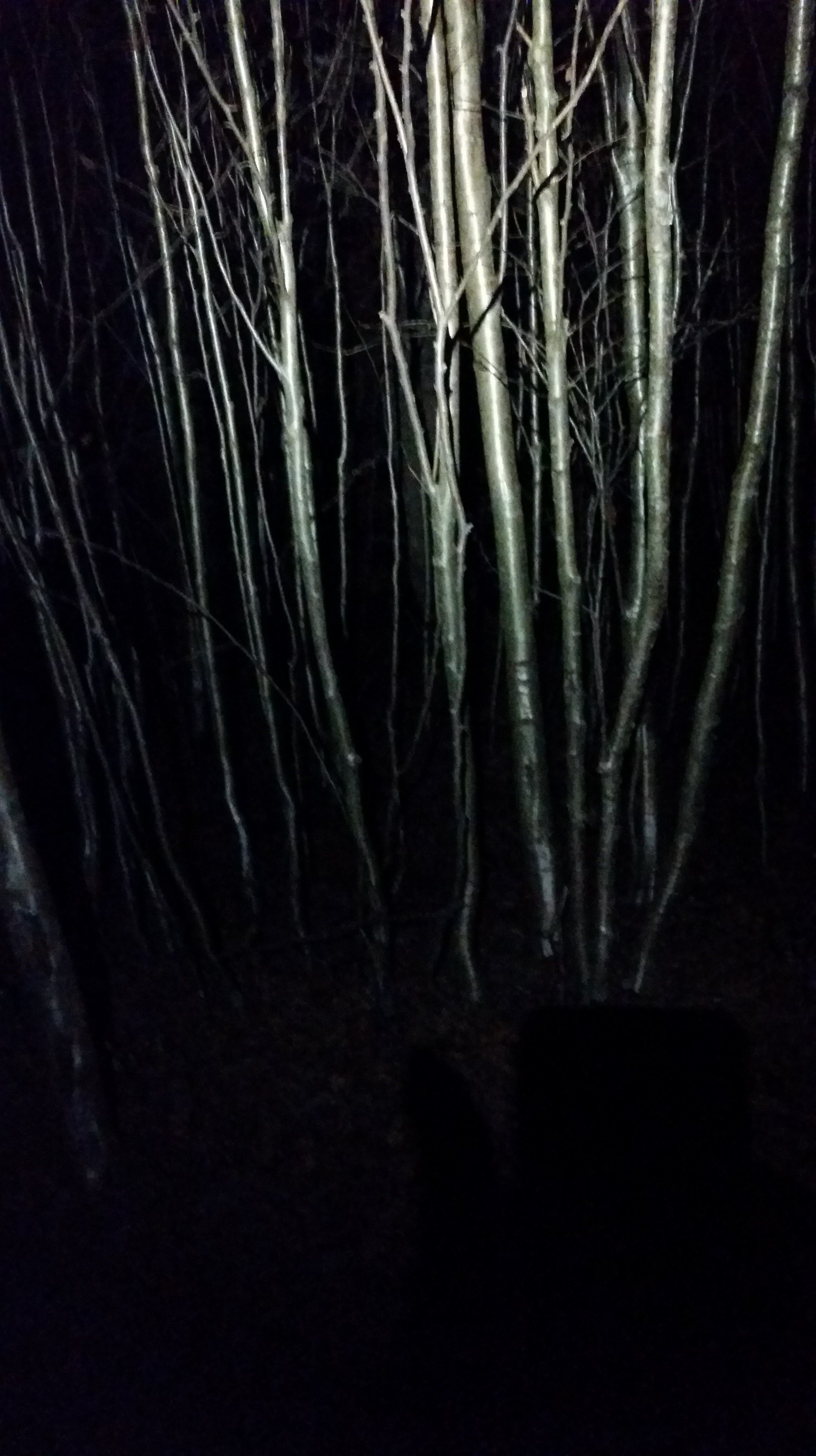 The shortcut hadn’t worked, and my feet were too cold to go back into the woods.  It looked like I was going to take the long way.  This meant another mile and a half of trail, rocky in places, wet in others, but mostly good walking, and I kept up a brisk pace to stay warm.  As long as I kept moving, my feet were fine, although they were getting colder as time passed.  After 30 minutes or so, the trail rose to a high point and then began to descend.  To the left was a forest of birch, shining silver in the headlamp’s glow.