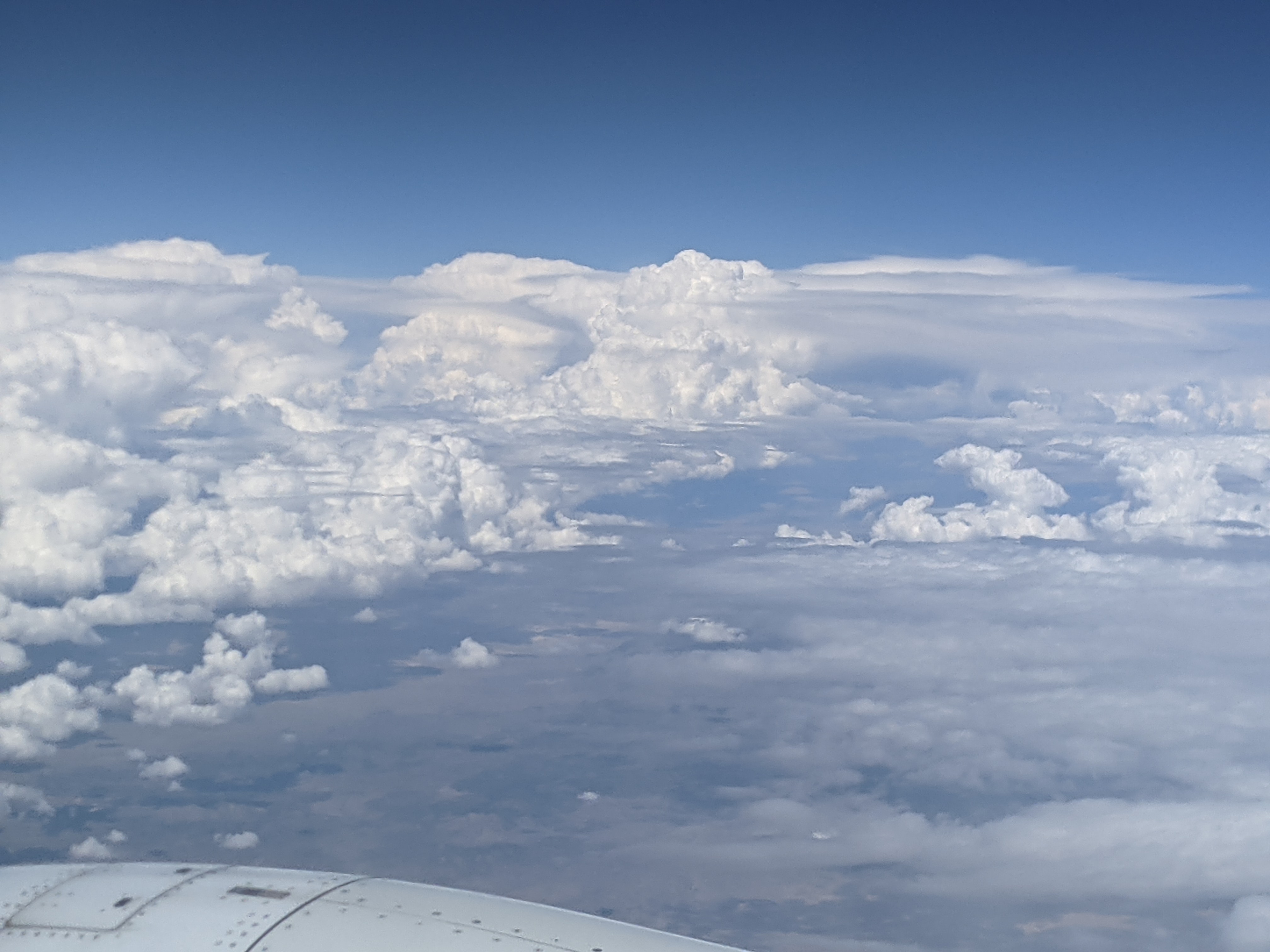 Out the airplane window, the scene was static. I tired of watching and turned my attention to a book. But every so often I looked up and found each time I did that the sky had changed. That slick white surface had expanded, frothed, pushed up through gray layers, breaking them apart. I realized that the bright blue light was not the horizon, but the surface of the cloudscape stretching north, while the horizon was tinged white, shading into darkness overhead.