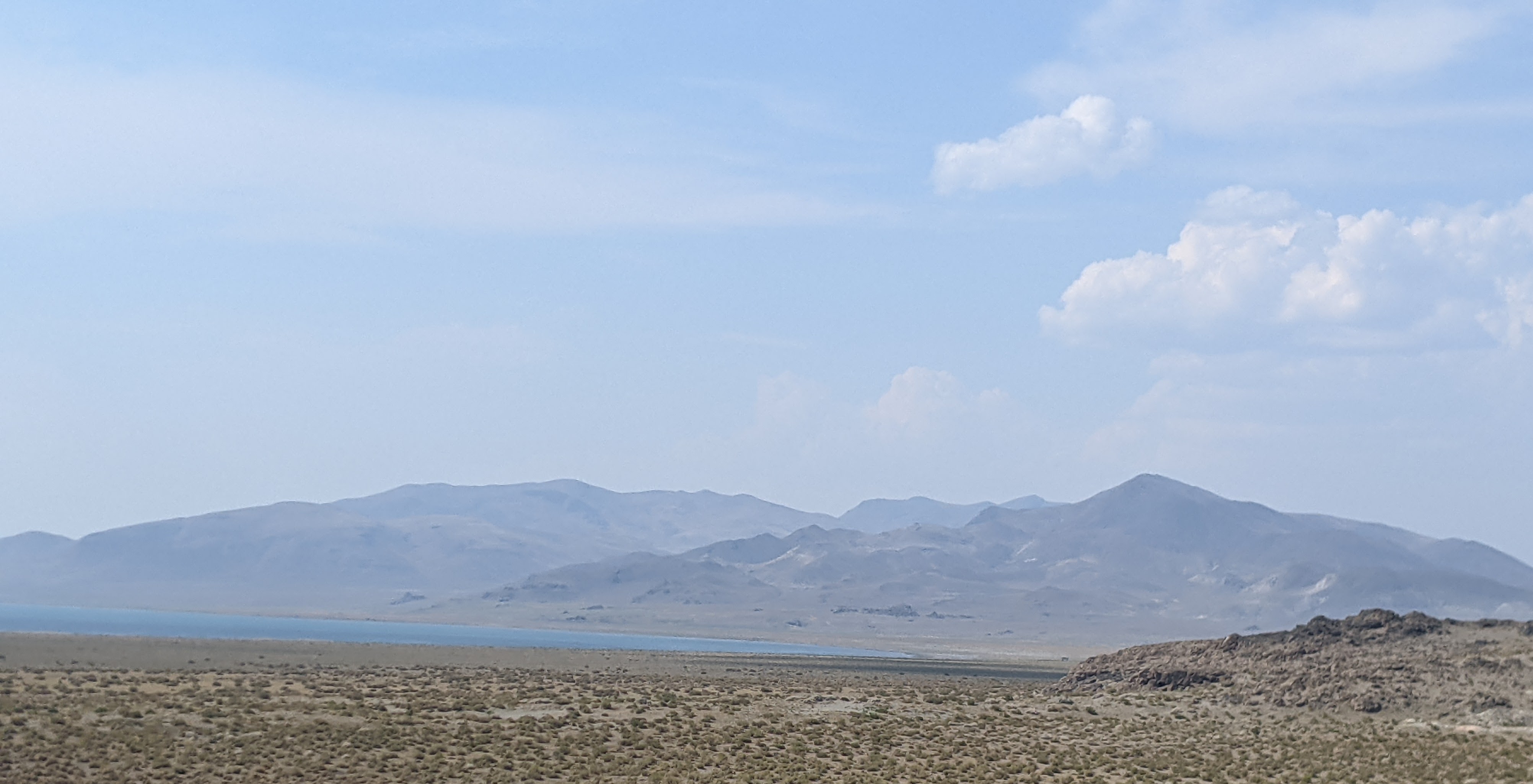 Pyramid Lake is a sink from which there is no outlet. It’s fed by Truckee River (named for the chief), which drains Lake Tahoe. After a 45-minute drive through rolling plains of sage, I saw a dusty band of turquoise beneath a range of dark gray peaks. Rising from the waters, a sharp little rock island, which evidently reminded the explorer John Fremont of an Egyptian pyramid when he saw it in 1844 — and hence the English name. (The Paiutes call the lake Cui-ui Pah after a distinctive species of fish, which happens to be some 2 millions years old and is found nowhere else.) I drove around to the other side, and from this vantage, the water was choppy and steel-colored. Gray clouds were gathering in the west. Overhead the boiling cumulus caught the sun and flashed. There was a soft peal of thunder. I walked a quarter mile along the lake, until my feet sunk into mud.