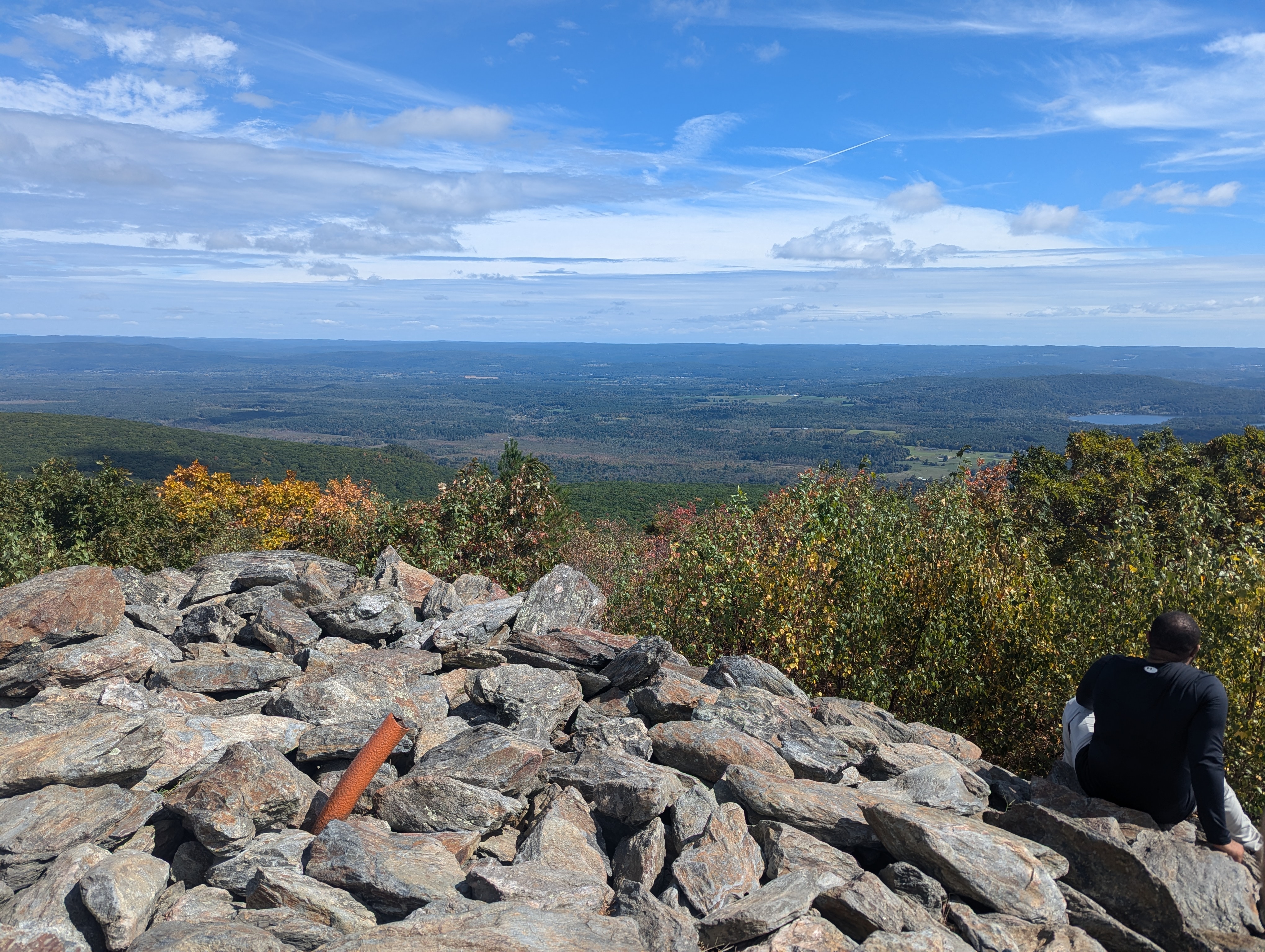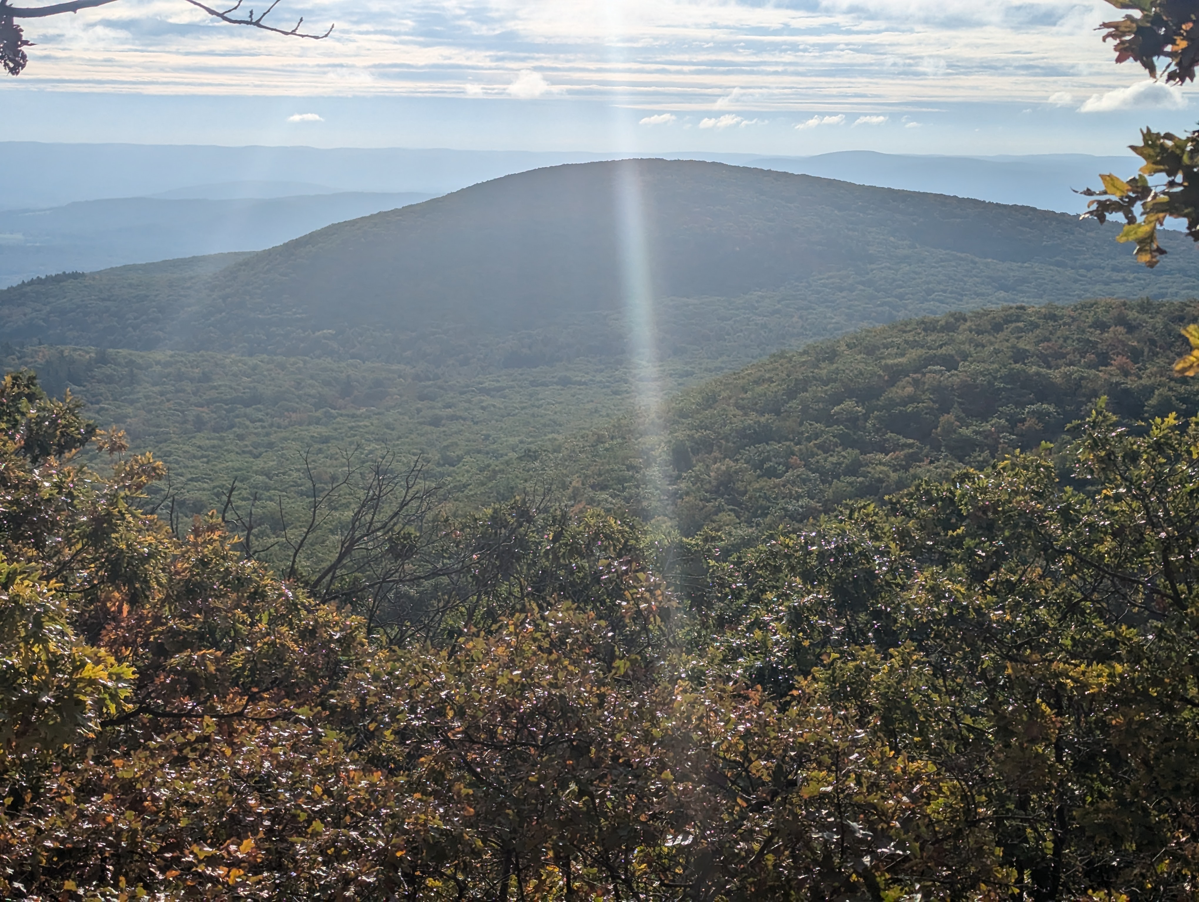 A slow, steep, painful scramble takes me to the top of my first peak – Round Mountain, elevation 2,280 feet. Views of rolling hills. Mostly green, with some sallow hints of autumn. The late September sun hangs in an empty sky, beaming down mildly – warm but not hot.