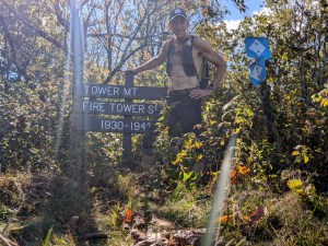 I pad across the summit of Honwee Mountain (2,313 feet) in the shadow of dense hardwood forest. The path intersects a paved road, which I take for a distance, enjoying faster pace and smooth sensation of bare feet on slick black asphalt. Reach Berry Mountain (2,203 feet), which is graced with a microwave tower surrounded by chain-linked fence. A soft grassy trail (The Taconic Crest Trail) takes me to Tower Mountain (2,193 feet), which used to have a fire tower but no longer does. Another peak – and then a glance at the watch, there’s still time, so another mile on a wonderful grassy trail, then all the way back, then a long steep descent bagging Pine (2,221 feet) on the way.