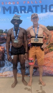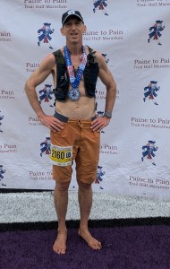 I flew out to Sioux Falls to run a marathon, only to have it canceled due to hot weather.  They let us run the ½ marathon, however, which was a mix of smooth paved trails where I flew and rough pavement with sharp pebbles embedded where I trotted slowly or veered onto the sidewalks and lawns by the side of the road.  To my astonishment, there was another barefoot runner – a personal trainer and Air Force veteran named Jay.  Like me, he seeks in the barefoot practice a more direct connection to the environment and a more natural experience.