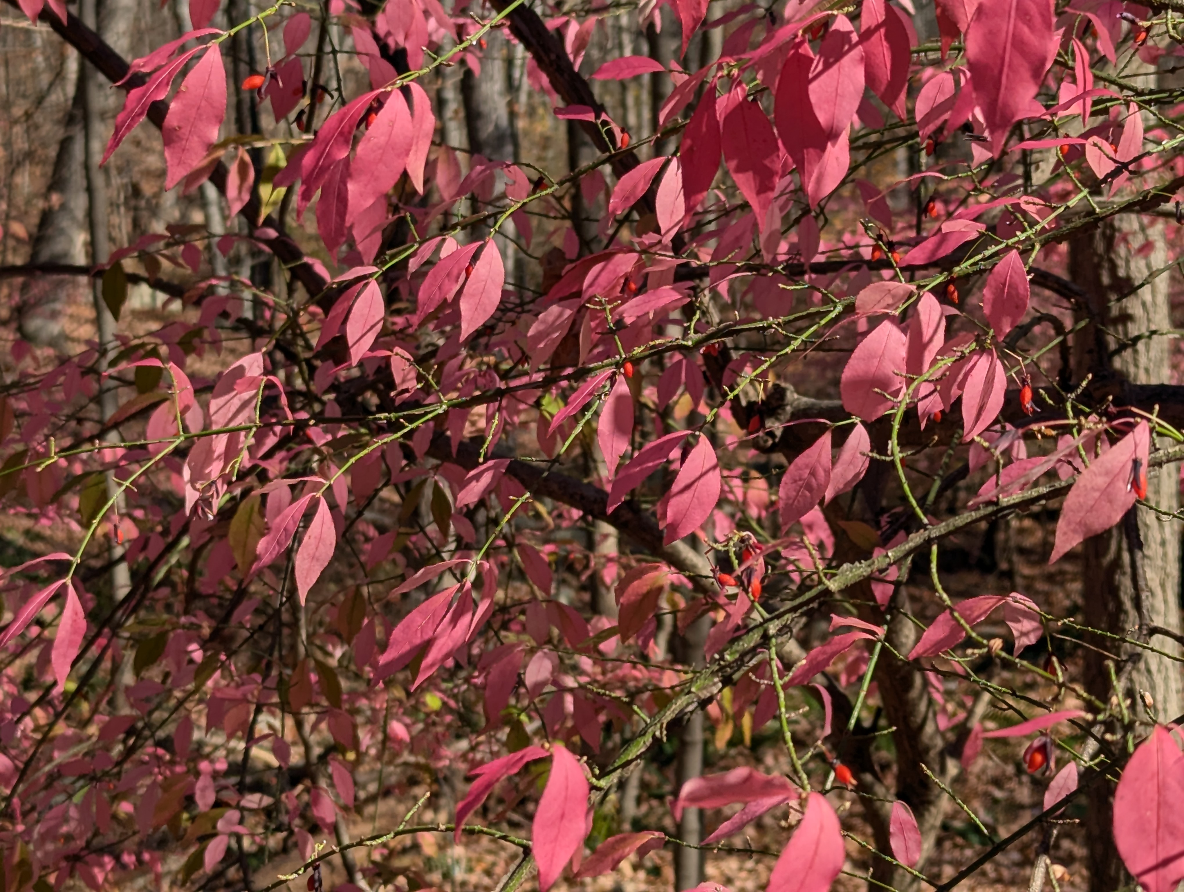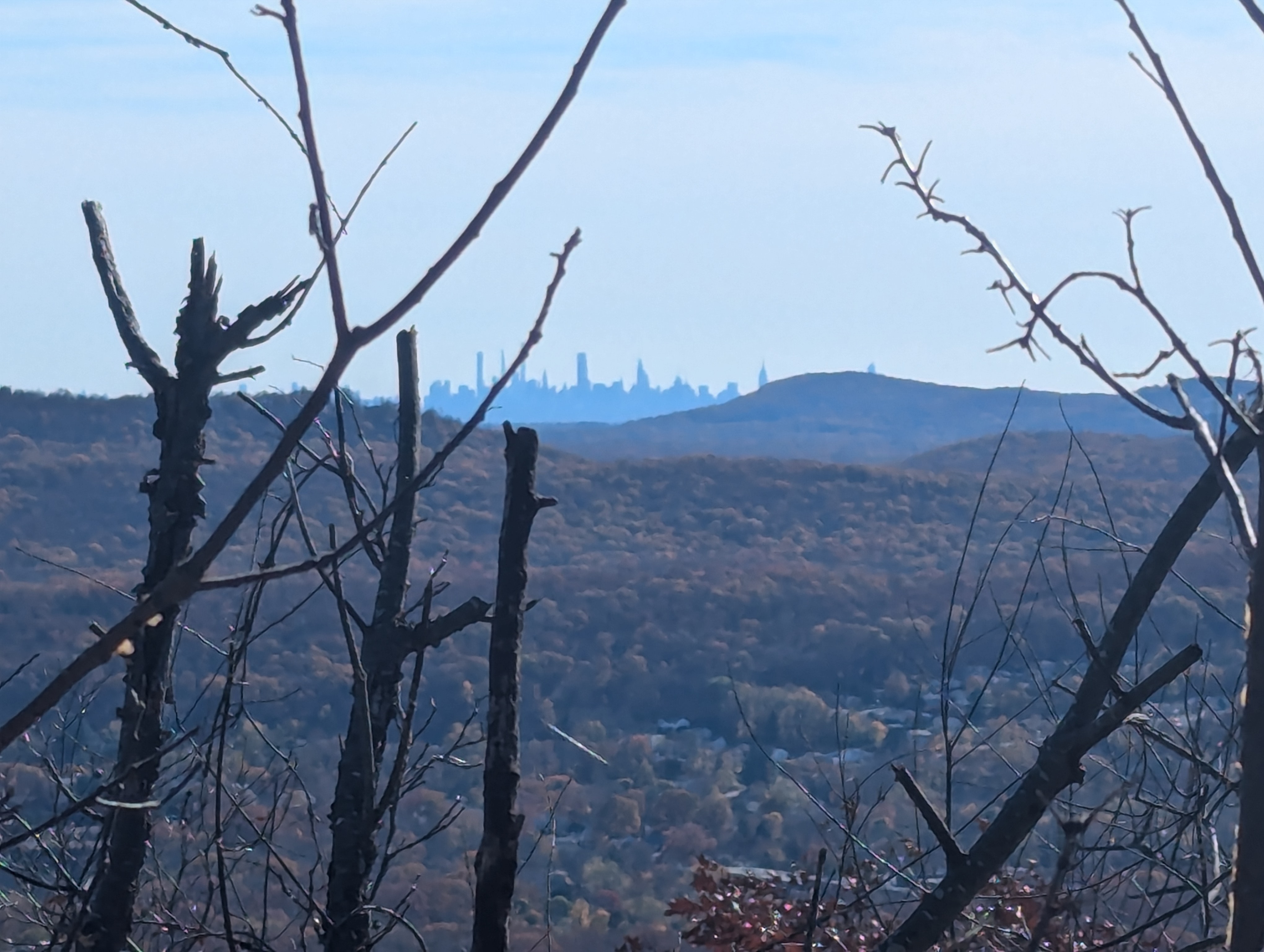 The Ringwood hike was so much fun – to feel the sun on my cheek on an unseasonably warm fall day – to find a weird pink forest full of burning bush, an exotic invasive – to stand on Board Mountain and survey the sparkling blue waters of the Wanaque Reservoir and through a gap in the hills glimpse NYC’s pencil-thin towers, such an alien sight in this natural landscape – to pass across the top of Bear Mountain through a grove of white pine and tread upon their long needles – to stand at the summit of Windbeam Mountain beneath a US flag on a pole and later to see that flag flapping cheerfully from the road below – to pad along the last mile back to the car on smooth black asphalt, such a joyful feeling underfoot after contending for hours with slippery leaves and hidden rocks.