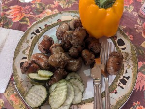 On the side, some pickles. I introduced pickles into my diet recently, after seeing an influencer on the social media platform X recommending them. Chris Cornell (@BiggestComeback) lost 80 pounds of excess body weight by shifting to a low-carbohydrate diet, typically limiting carbs to 50 grams per day or less. One of his key themes is satiety — he chooses foods that leave him feeling satisfied, not bloated or distended, while avoiding the processed stuff that leads to endless cravings. A favorite meal for him is ground beef with cheese and some pickles. On this diet, he’s sustained his 80-pound weight-loss for several years. I read the label – “cucumbers, water, distilled white vinegar, salt, garlic, dill, grape leaves.” This is acceptable. Once I bought a jar of pickles which I noticed, after I’d eaten them, contained an artificial sweetener. I felt deceived.