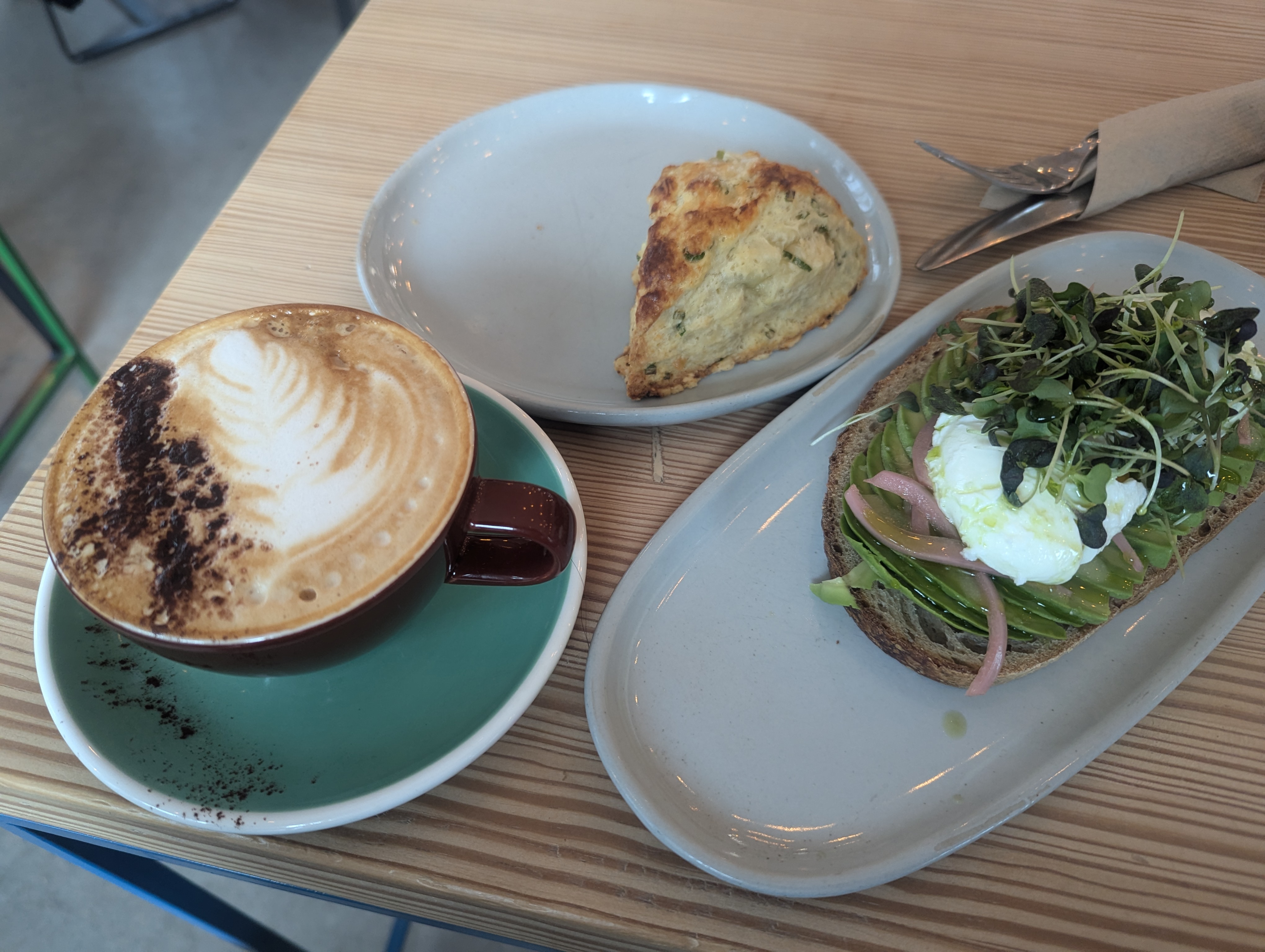 Having skipped breakfast, I went for an 8-mile run, then headed to a favorite coffee shop for a late lunch (17-hour fast complete, and noted in my training log, bringing me to 185 hours fasted over the last 30 days and therefore in compliance with my protocol). Lunch consisted of avocado toast with two eggs, a scone, and a cappuccino.