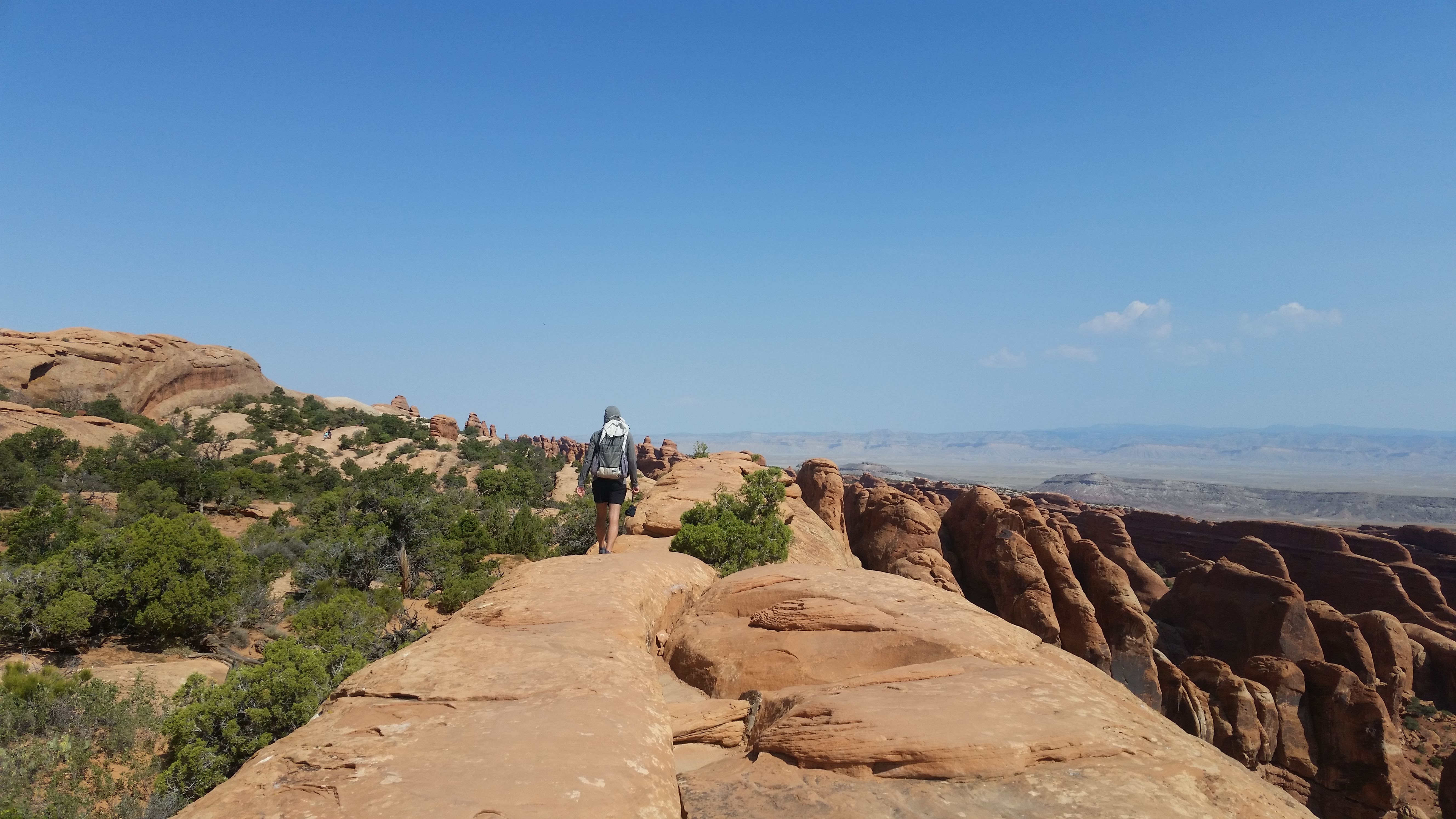 In contrast, I’ve hiked in Utah on fins and ridges composed of Navajo formation sandstone (nearly 200 million years old) compacted from vast seas of wind-whipped dunes. Here the ledges are rounded – they start off flat but then gradually roll off into space. Depending on the grip of your shoes (or feet), there is a point of no return, similar in concept to the black hole Event Horizon, where the pitch is steep enough for you to start sliding. Yet there’s another factor to consider – Navajo sandstone is “friable,” meaning the rocks deteriorate under weathering. As a result, you might find, as the slope gets steeper, that there are loose grains of sand underfoot. A sudden slip and fall could send you towards the point of no return more quickly than expected.