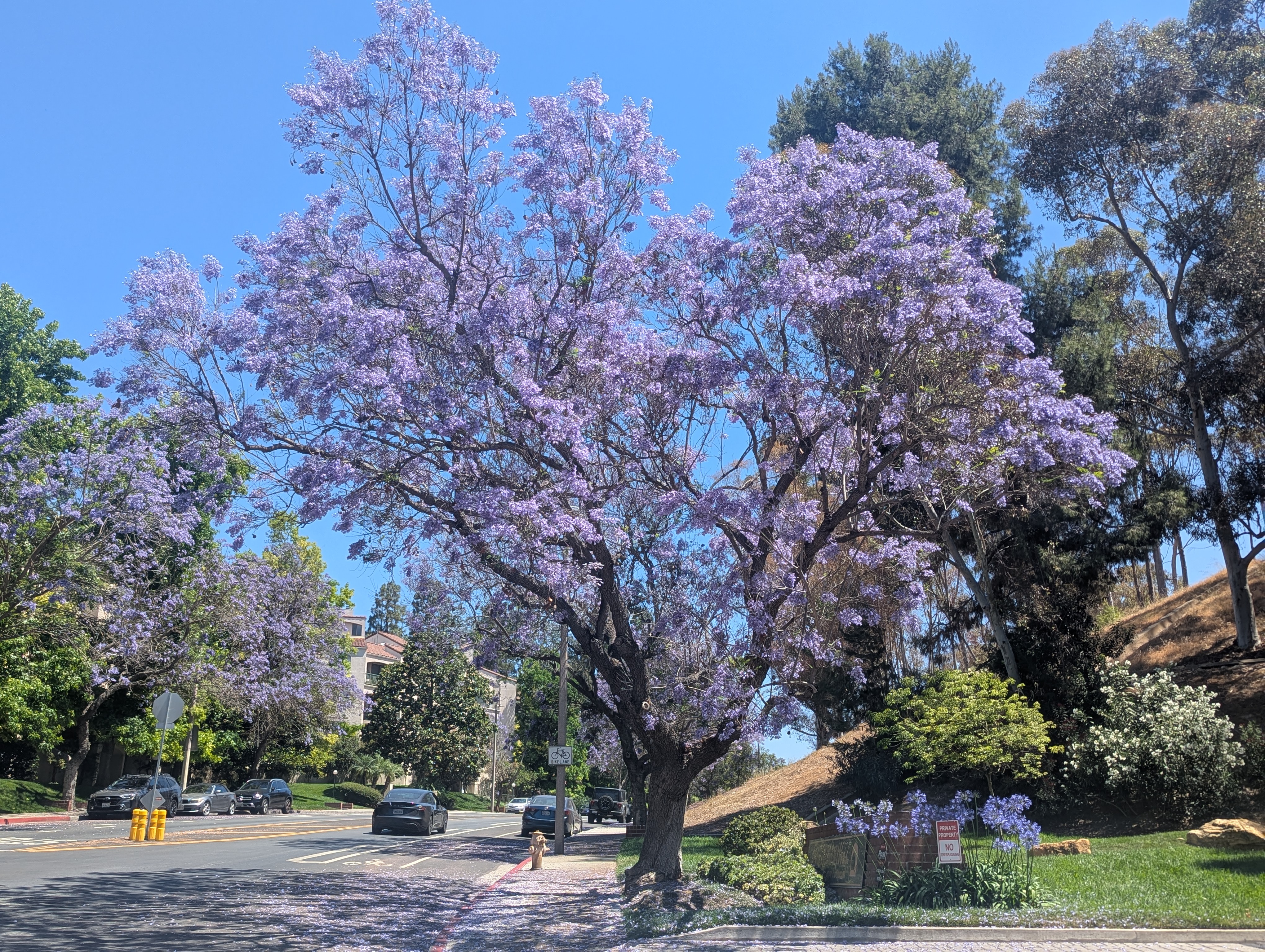 Evening shadows are lengthening as I turn into a quiet lane nestled between steep hills just south of Pasadena. Jacaranda trees with blue blossoms line the streets, and the sidewalks are littered with blue petals.