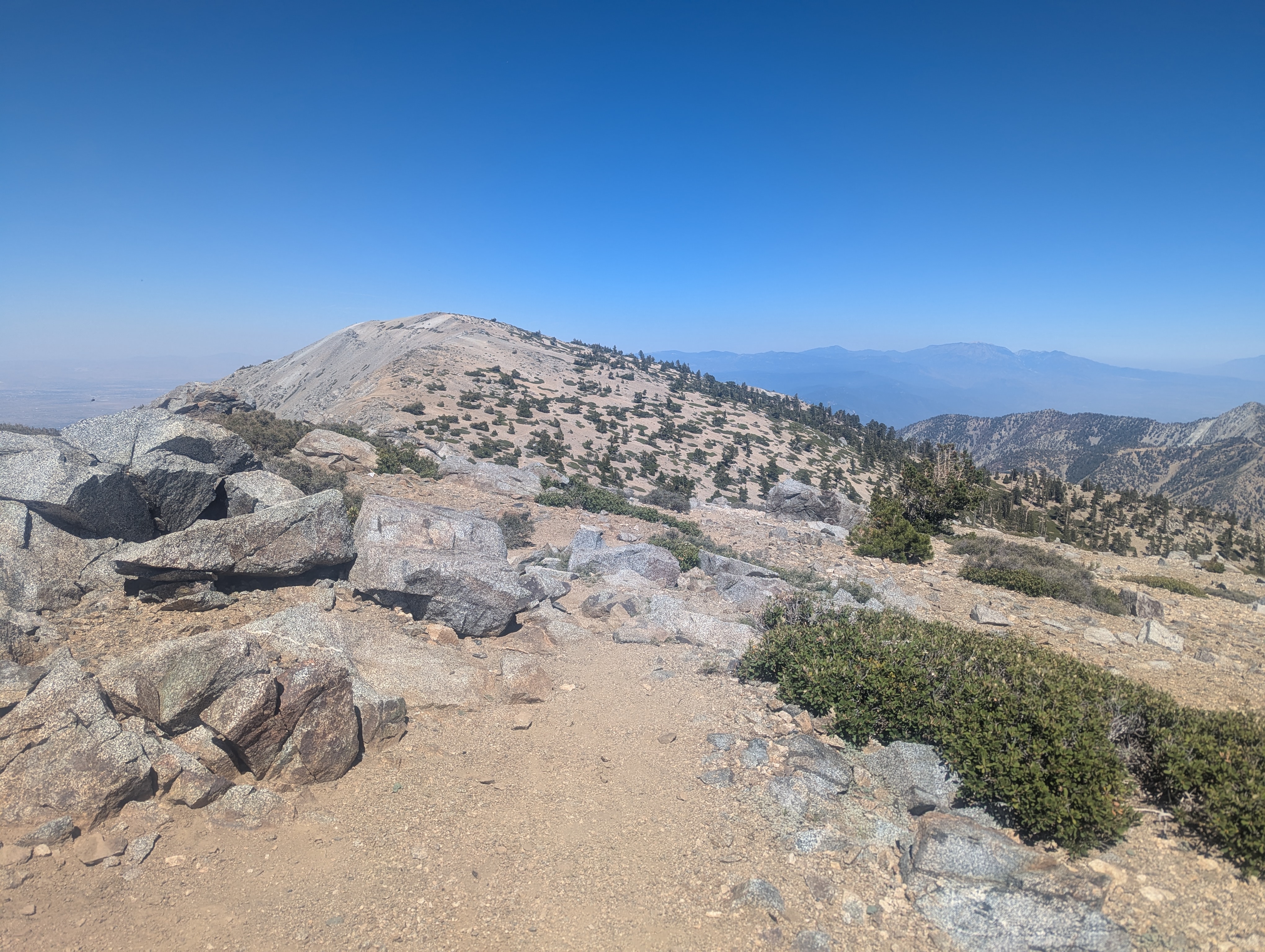 I headed out for the next peak, Mount Sawmill (8,822 feet) along a narrow footpath, which followed some lazy switchbacks down the hill. The drop wasn’t far, but unlike the sandy road, the path was cluttered with rocks, and soon my feet began to feel the points. From the summit of Sawmill, the Central Valley loomed to the north. Somewhere out there lay the town of Bakersfield. To the east lay the plains of the Mojave Desert, broiling in the sun. Later I would be driving through the desert, braving temperatures of 105 F, without air conditioning, of course, which I never use in cars when driving by myself. I have always hated the idea of hiding from reality.
