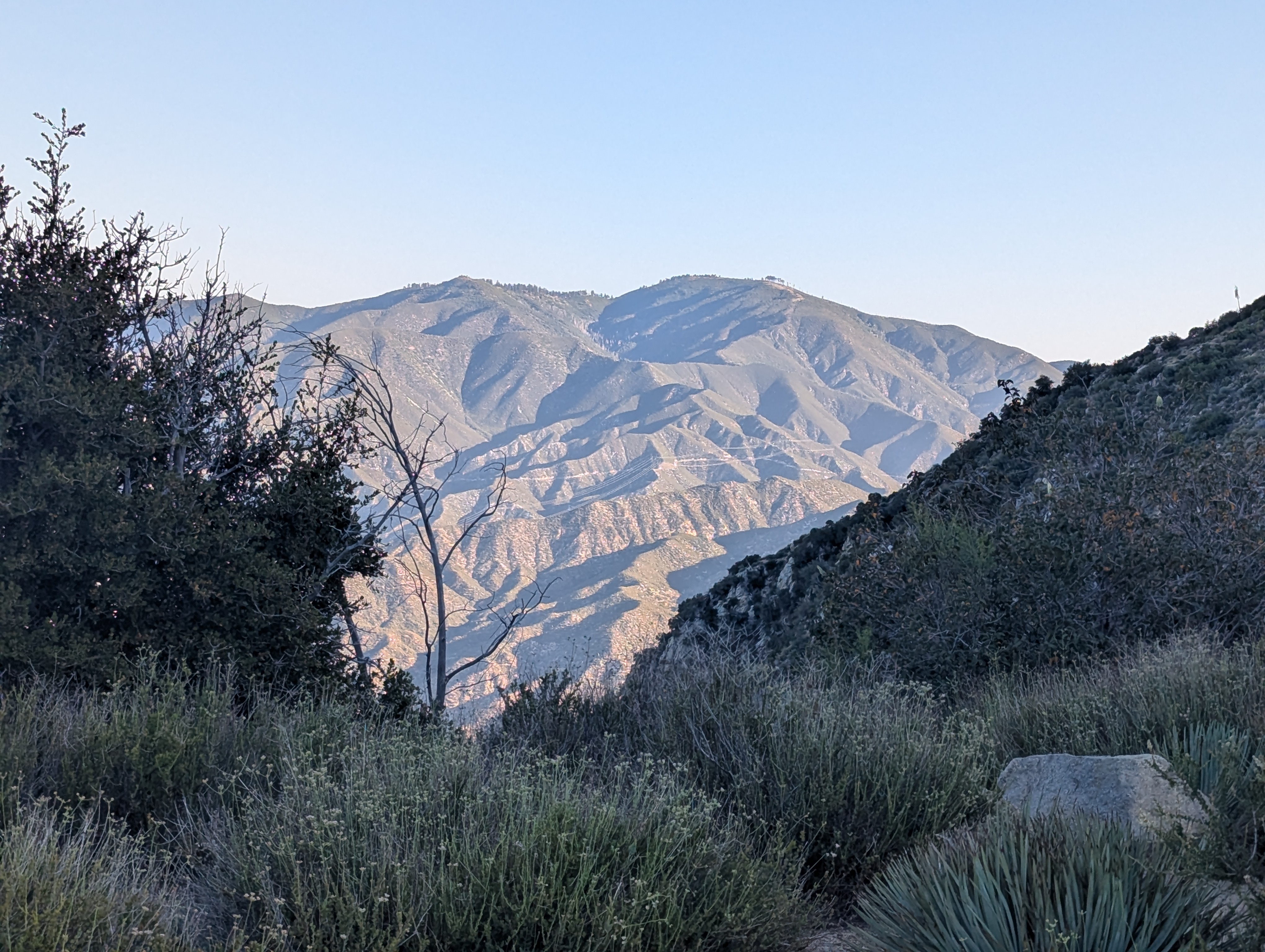 There are more calls the next day, but finishing early, I drive off to the Mt. Wilson observatory, intending to bag more peaks. It’s 3:00 pm when I arrive, which should have given the ground some time to cool, but the trail to Mt. Harvard (5,441 feet) is composed of a dark brown mix of sand and dirt, and it might as well have been on fire. I scamper through a burned-out forest, pausing beneath a charred tree to cool my feet in the shade cast by a blackened trunk, before dashing to the next small shadow. After a half mile, the trail reaches a gray gravel road that isn’t quite as hot, but the surface contains a quantity of shot rock, i.e., chunky sharp-edged gravel. And the grade is quite steep. The short climb to the summit is slow and painful. The reward for this effort is a radio tower installation. A sign on the chain-link fence warns that radiation levels may exceed federal safety standards, but the gate is open and a pickup truck is parked next to a squat building. I stroll in nonchalantly, stand on a slab of concrete and peer down at the route to the next mountain on the ridge. There is no path visible, merely a large power cable anchored to the rocks. I decide against going any farther.