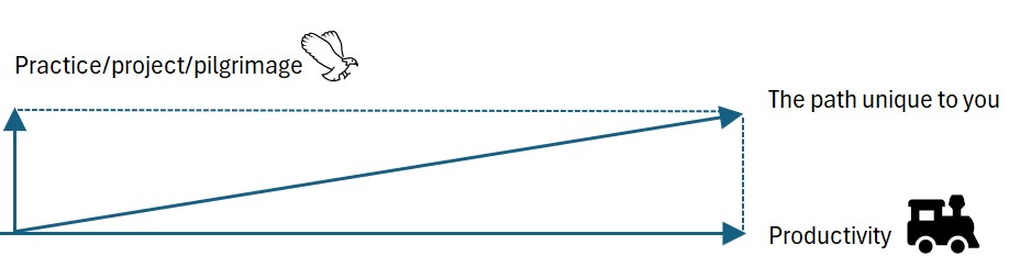 I drew this simple diagram to make my point a little clearer. The productive life is represented with a horizontal arrow leading straight ahead toward the hoped-for goal of progress. Think of this arrow as representing the train of progress. In contrast, a practice, big project, or pilgrimage is shown as an arrow heading off “orthogonally,” meaning in a different direction — a direction which may have nothing to do with productivity — which may depart from conventional wisdom. Add these two vectors together and you get a new direction. Maybe it is the special path that’s exactly right for you.