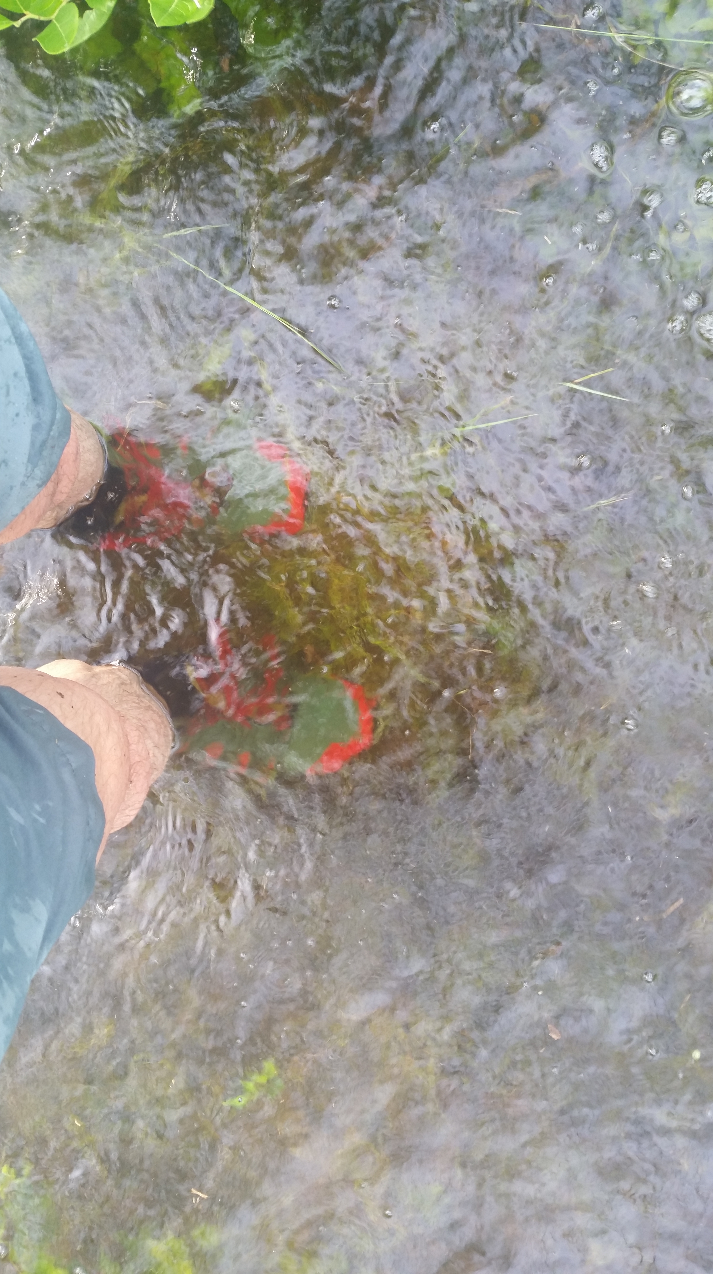 The SRT reentered the woods through a patch of mud, and shoes and socks were quickly soaked. The path turned to soft dirt then crossed a talus field of conglomerate boulders, forcing me to hop tentatively from rock to rock.