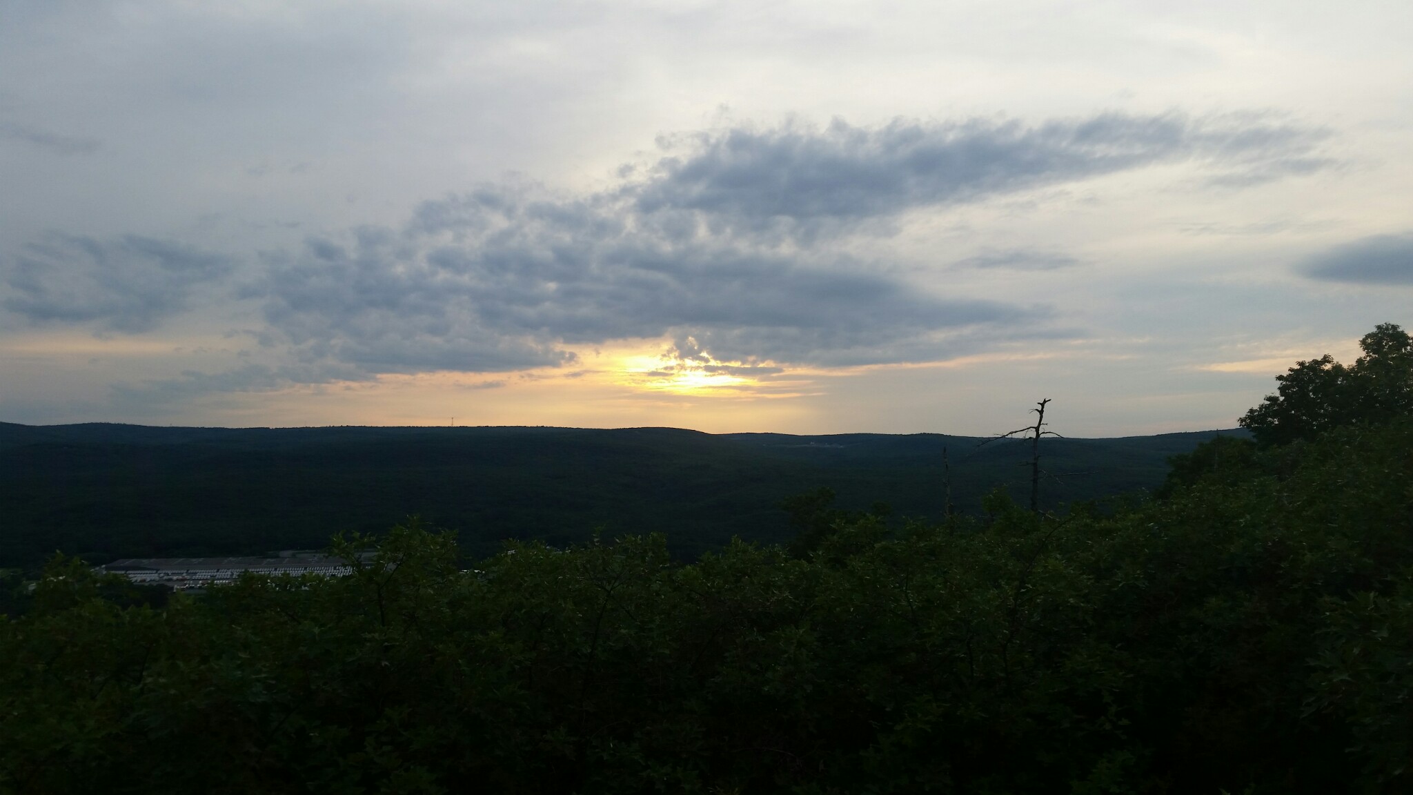The road through Wurtsboro allowed me to make up some time; police station, art studio, car repair, post office, motorcycle dealer flashed by, and soon I was climbing Wurtsboro Ridge and now for the first time encountering the difficult conglomerate jumble characteristic of the Gunks. I climbed up a rocky trail, then stepped carefully across slabs of conglomerate slanted at angles that could send your feet flying out from under you, and finally stopped for the first food of the day at mile 30, where I rested on a rock, watching the sun slip below the horizon.